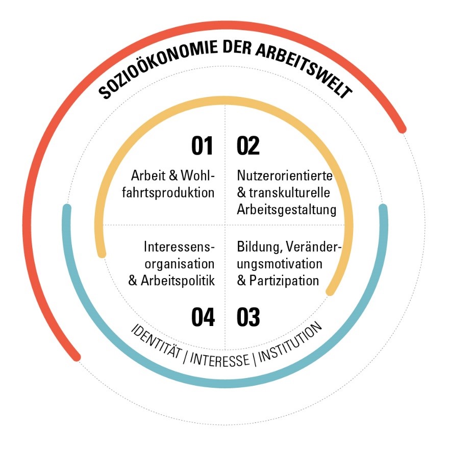 - Arbeit und Wohlfahrtsproduktion | Chancen und Risiken neuer und tradierter Berufe, neue Netzwerkarrangements, Arbeitsfelder und Aufgabenkomplexe für die Wohlfahrtsproduktion, die wirtschaftliche Entwicklung und für individuelle (berufs-)biographische Entwicklungsperspektiven.