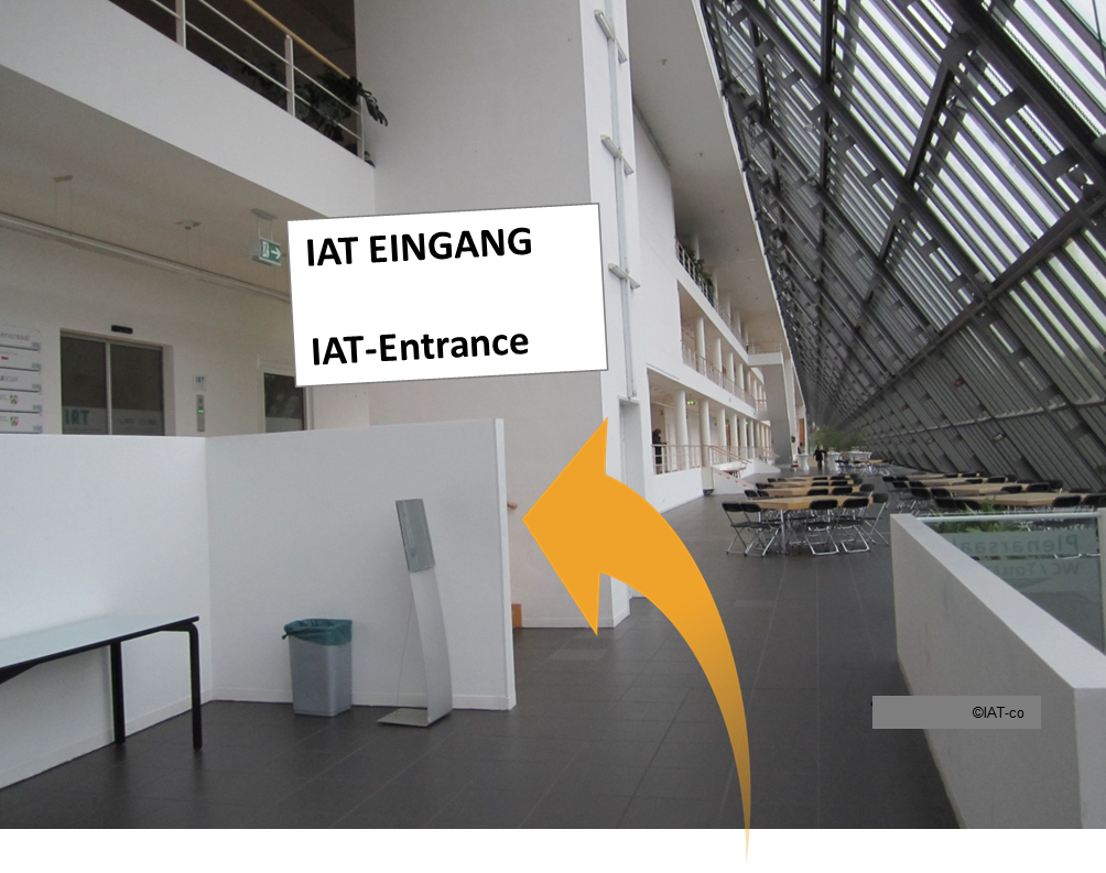 - Leave main station Gelsenkirchen Hbf towards exit “Neustadt” proceed straight forward for approximately 8 minutes towards Wissenschaftspark (Science Park) or Arbeitsgericht (labour court). At the traffic light cross the street, on your right, you will find the Institute for Work and Technology.