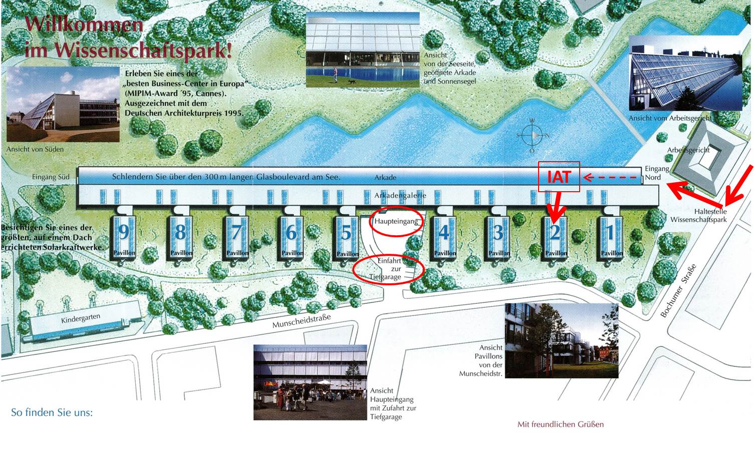 - From the A40 motorway: Leave the motorway at exit Gelsenkirchen and proceed for approximately 2.5 kilometres on the B 227 in the direction of Gelsenkirchen-Zentrum. After the gas station, turn right into Mundscheidstr. at the 2nd traffic light. After approximately 500 metres, on your right you will find the Institute for Work and Technology (in the Science Park).