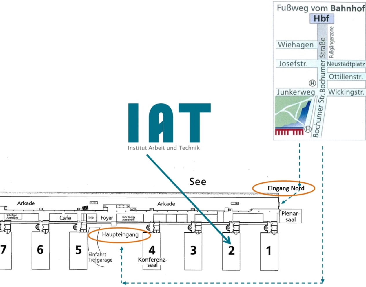 - From the A42 motorway: Leave the motorway at exit Gelsenkirchen-Zentrum and proceed for approximately 1.6 kilometres on the Grothusstr. direction Gelsenkirchen-Zentrum. At the junction Overwegstr./Florastr., turn left into Florastr., then turn right into Luitpold-Str. (changes to Ringstr.). After approximately 2.2 kilometres, on your right you will find the Institute for Work and Technology (in the Science Park).