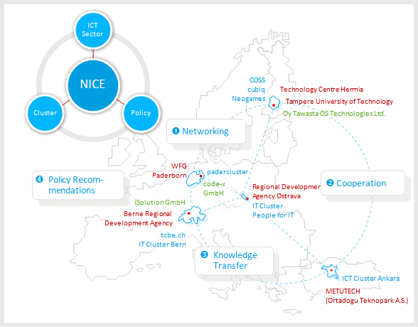 Following this notion NICE – Networking ICT Cluster in Europe aimed at strengthening the European ICT sector by facilitating the growth of networking clusters, sourcing the skills and experience of successful businesses to guide the creation of new jobs and help develop innovative business ideas.