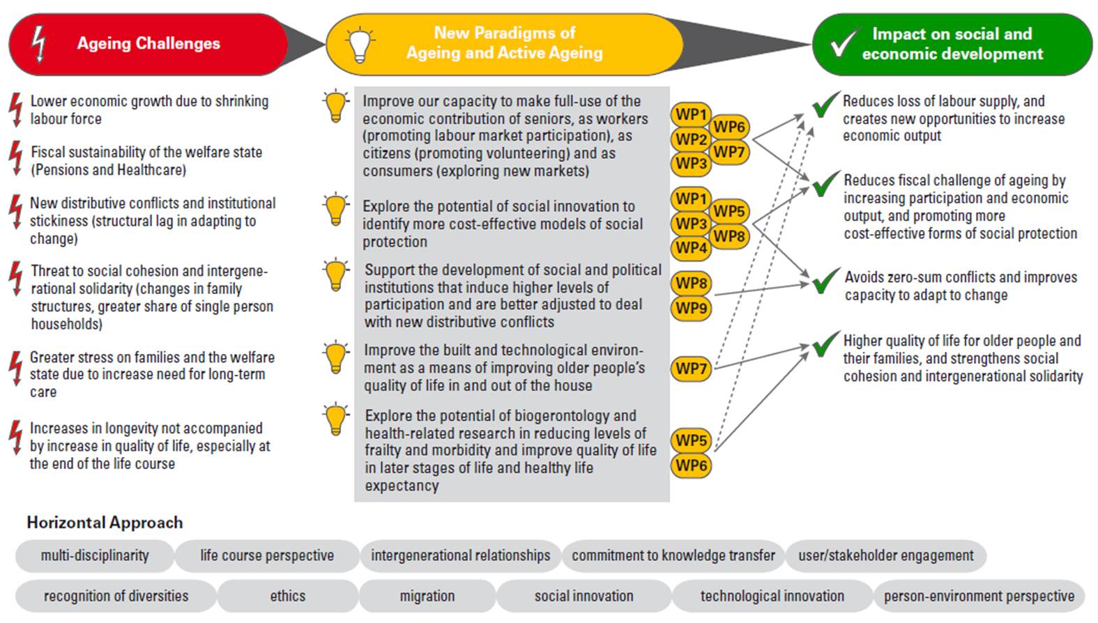 Um diese Chance zu nutzen, ist es daher notwendig ein umfassendes Alter(n)skonzept zu erstellen und Alter(n) aus unterschiedlichen wissenschaftlichen und praktischen Blickwinkeln zu betrachten: Biologische Aspekte des Alterns werden ebenso berücksichtigt wie volkswirtschaftliche und wohlfahrtsstaatliche Auswirkungen, soziale Teilhabe und Anforderungen an die Gestaltung der Lebenswelt. Dabei werden alle Ergebnisse sowohl mit Vertretern der Wissenschaft wie auch Praxis diskutiert und rückgekoppelt.