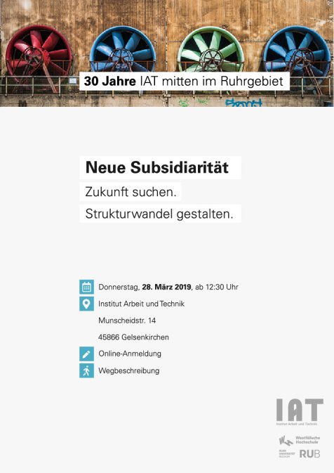 Viele Vorschläge hat es bereits gegeben, wie die Kommunen des Ruhrgebiets die Probleme ihrer Region gemeinsam lösen könnten – die Umsetzung ist letztlich aber immer hinter den Möglichkeiten zurückgeblieben. Eine „neue Subsidiarität“ fordert das Institut Arbeit und Technik (IAT/ Westfälische Hochschule). „Verantwortung für Kooperation übernehmen, die Eigensteuerung in der Region aktivieren!“ lautet der Vorschlag von Regionalforscher Dr. Stefan Gärtner, Direktor des Forschungsschwerpunkts Raumkapital am IAT. Die „neue Subsidiarität im Ruhrgebiet“ wird auch Thema des Symposiums zum 30jährigen Jubiläum des IAT am 28. März im Wissenschaftspark Gelsenkirchen sein.