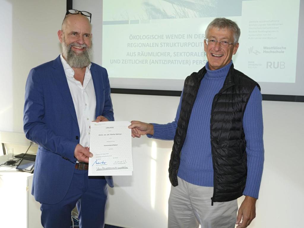 Vorher hatte der Dekan, Prof. Dr. Dietwald Gruehn, Stefan Gärtner seine Urkunde zur Ernennung als Honorarprofessor der TU Dortmund übergeben. Im Anschluss an die Vorlesung fand eine interessante Diskussion zwischen Prof. Gärtner, den Hochschullehrerinnen und -lehrern der Fakultät und Gästen statt.
