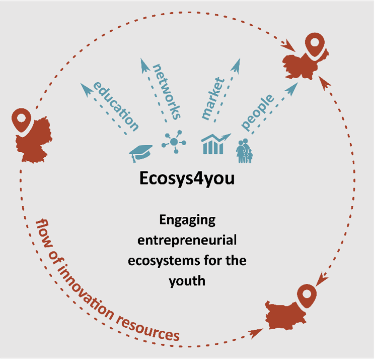The Ecosys4you project is funded by the European Commission under the Horizon programme. The project partnership is committed to improve the flow of innovation resources between entrepreneurial ecosystems of the regions Ruhr in Germany, Varna in Bulgaria, and Maribor in Slovenia. It develops an entrepreneurial education programme by establishing innovative interlinkages between the actors of the entrepreneurial ecosystems. Private, public and educational actors are in the consortium and represent the three entrepreneurial ecosystems.